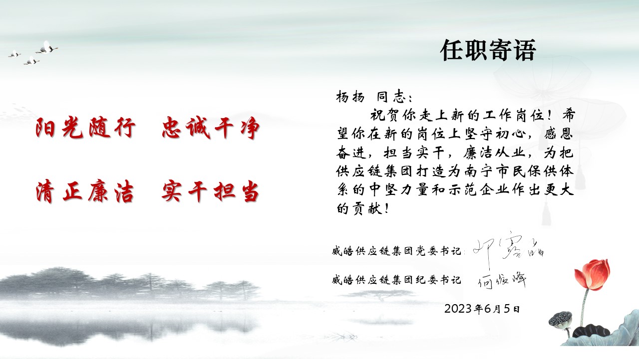 “XX同志:祝贺你走上新的工作岗位!希望你在新的岗位上坚守初心,感恩奋进,担当实干,廉洁从业,为把供应链集团打造为南宁市民保供体系的中坚力量和示范企业作出更大的贡献!”2023年6月5日下午,威皓供应链集团首发力第一时间为整合重组调整的24名中层管理人员开具任职提醒“第一配方”,通过电子卡形式送上祝福、寄语期望、以廉润心,警醒新任职的中层管理人员清醒任职、廉洁履职,为履新人员扣好“第一粒扣子”。“良言一...