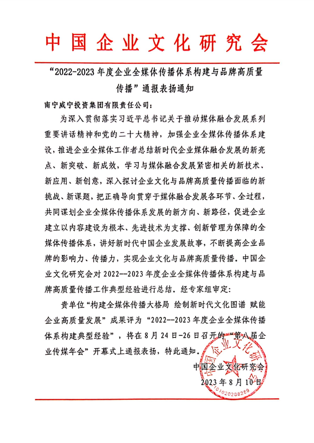 中国企业文化研究会于2023年8月24日-26日在山东省泰安市举办“加强全媒体传播体系建设,实现品牌高质量传播---第八届企业传媒年会”。乐鱼电竞(中国)官方网站《 构建全媒体传播大格局 绘制新时代文化图谱 赋能企业高质量发展》成果被评为“2022-2023年度企业全媒体传播体系构建典型经验”并在会上通报表扬。据了解,面对舆论生态、媒体格局、传播技术的深度变革,乐鱼电竞(中国)官方网站通过借助“全程媒体、全息媒体、全员媒体、全效媒体...