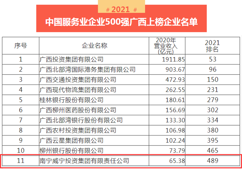 日前,中国企业联合会、中国企业家协会发布“2021中国服务业企业500强”榜单,乐鱼电竞(中国)官方网站位列第489位,成为唯一一家连续六年入围中国服务业企业500强的南宁市属国有企业。此前,广西企业与企业家联合会公布了广西企业100强、服务业企业50强榜单,乐鱼电竞(中国)官方网站分别位列第48位、20位。