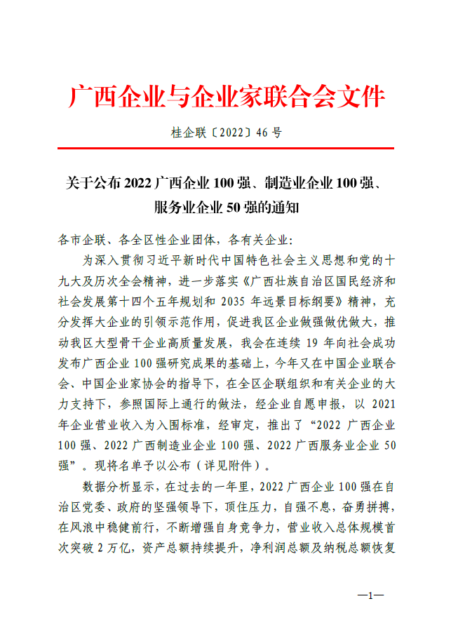 近日,广西企业与企业家联合会发布的2022广西企业100强名单、制造业企业100强名单及服务业企业50强名单,乐鱼电竞(中国)官方网站入选“2022广西企业100强名单”第49位,“2022广西服务业企业50强名单”第16位。近年来,乐鱼电竞(中国)官方网站始终秉承“敢为人先,追求卓越”的企业精神,以国有资本运营公司改组为契机,聚焦服务民生的战略定位,坚持全产业链发展方向,不断深化国企改革,加快转型升级,企业综合实力不断增强,改革发展成果丰硕。截...