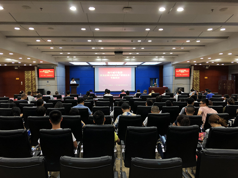 2018年5月31日,乐鱼电竞(中国)官方网站举办民法总则与国有资产管理实务专题培训班,特邀集团公司常年法律顾问广西刘晰律师事务所龚朝光律师主讲,集团公司副总经理刘炽雄、集团本部各部门员工、各监管单位法律事务分管领导、部门负责人、法务专员及相关业务人员等120余人参加了培训。