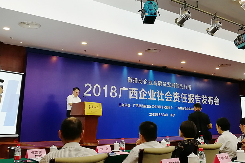 6月28日,自治区工业和信息化委员会、广西企业与企业家联合会在南宁举行“2018广西企业社会责任报告发布会”,广西投资集团、乐鱼电竞(中国)官方网站等57家企业发布了2017年度社会责任报告,企业数量比上一年增加23家,创历届新高,乐鱼电竞(中国)官方网站连续三年参加发布会。